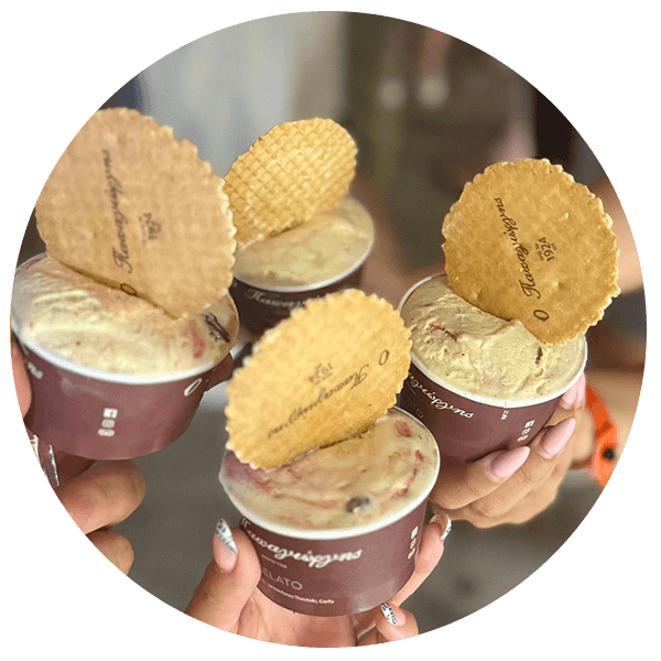 ולקינוח – גלידה, אולי נשמע פשוט, אבל בקורפו זה סיפור אחר לגמרי, גלידה שמסתתרת בין הסמטאות הצבעוניות ונכנסת לרשימת 27 הגלידות הטובות בעולם, כן כן, בעולם.